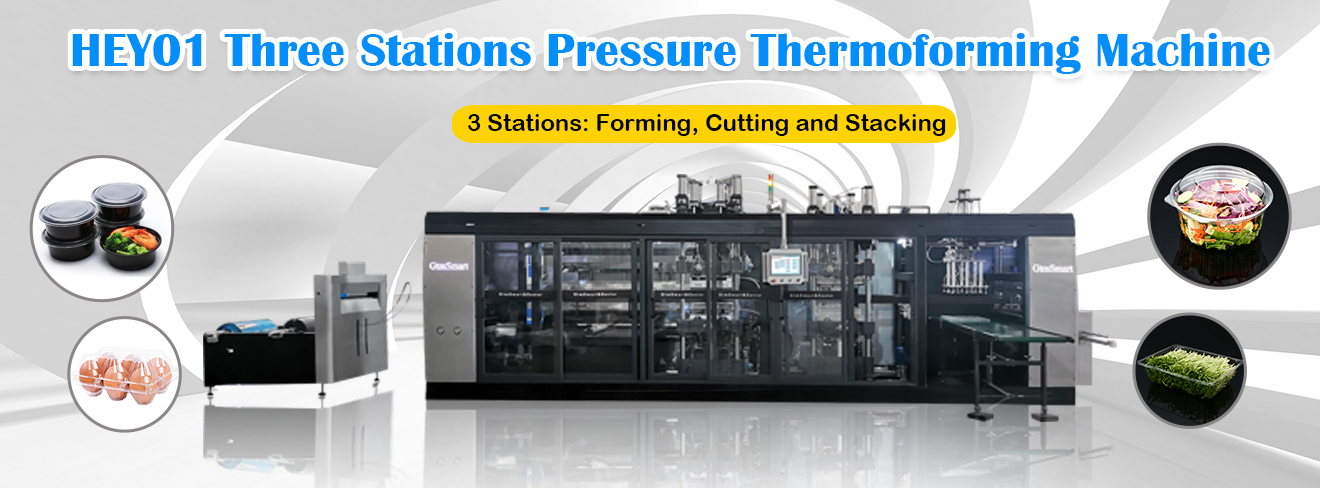 HEY01 PLC Pressure Thermoforming Machine With Three Stations can produce diversified clamshell type packaging boxes. With advanced thermoforming process, that will be able to produce high-quality clamshell type packaging, which is suitable for long-distance transportation and processing, and reach the shelves for sale in the best state.