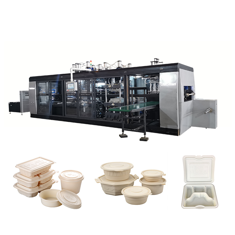 GTMSMART PLC Pressure Thermoforming Machine With Three Stations Mainly for the production of variety plastic containers ( egg tray, fruit container, food container, package containers, etc) with thermoplastic sheets, such as PP,APET, PS, PVC, EPS, OPS, PEEK, PLA, CPET,etc.